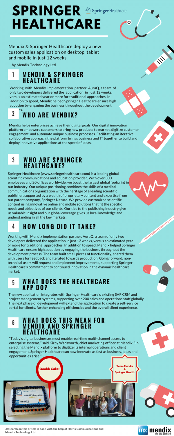 A team of just two developers from AuraQ recently delivered a new custom global sales and operations application to Springer Healthcare, a leading scientific communications agency, on desktop, tablet, and mobile devices in only 12 weeks. Using Mendix, a provider of application Platform-as-a-Service (aPaaS) and digital innovation, the new application provides unified access to client information, quotes and more. Designed to increase sales and operational efficiency, improve client service and deliver integration to support more than 200 sales and operations staff globally, the solution was delivered in just 12 weeks, versus an estimated year or more for traditional approaches